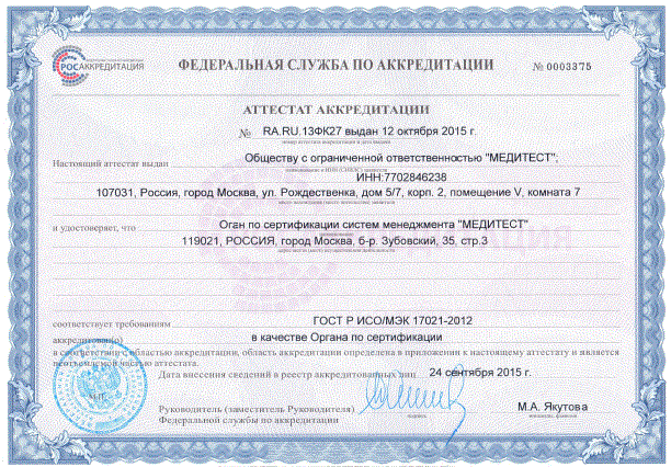 Аттестат и область аккредитации органа по сертификации систем менеджмента (RA.RU.13ФК27):